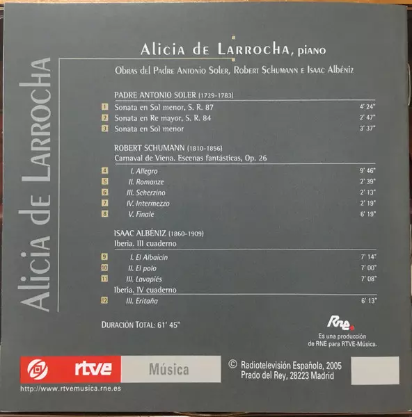 | Artist | Robert Schumann | Isaac Albéniz | Alicia De Larrocha | Padre Antonio Soler |