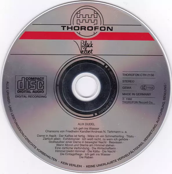 Alix Dudel: Ich Geh Ins Wasser version on CD in Standard edition. This particular edition was published in Germany in publishing company Thorofon in cooperation with Black Velvet (3) on 1. December 1992. Album spans genres Pop, Folk, World, & Country and Chanson.
