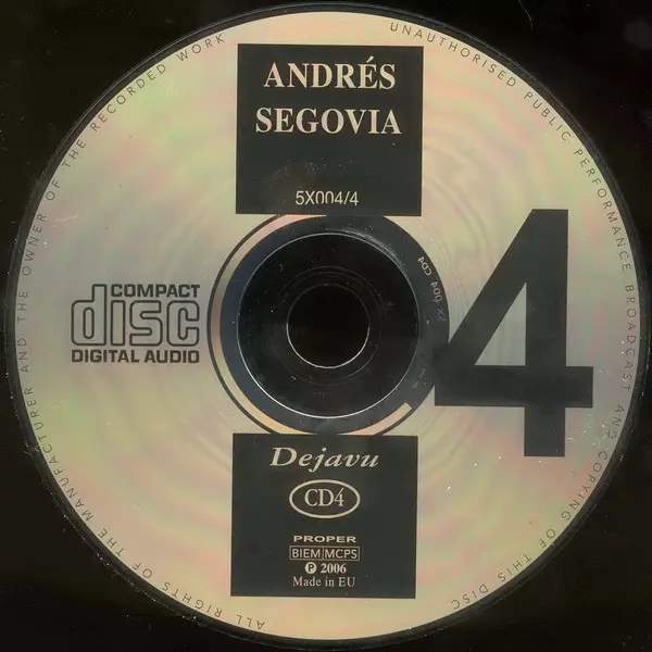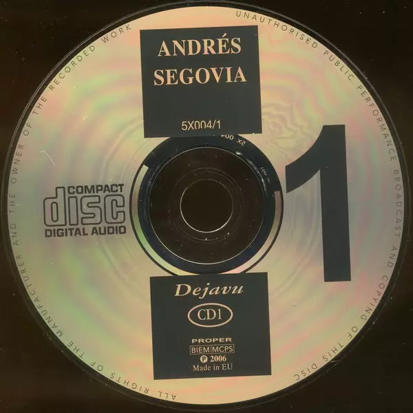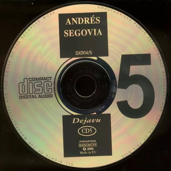 Andrés Segovia: Andrés Segovia version on 5CD in Standard edition. This particular edition was published in Europe in publishing company Recording Arts SA on 21. October 2010. Album spans genres Classical and Folk, World, & Country.