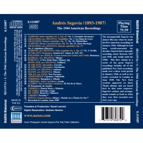 Andrés Segovia: The 1944 American Recordings version on CD in Standard edition. This particular edition was published in Europe in publishing company Naxos Historical on 21. March 2006. Album can be classified in the genre Classical.