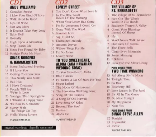 Andy Williams: Long Play Collection version on 3CD in Standard edition. This particular edition was published in Europe in publishing company Goldies in cooperation with IMC Music Ltd. on 14. June 2011. Album spans genres Pop, Vocal and Easy listening.