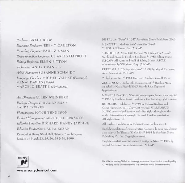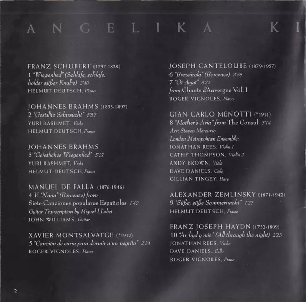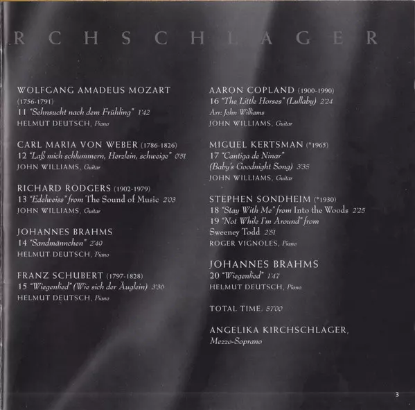 Angelika Kirchschlager: When Night Falls version on CD in Standard edition. This particular edition was published in Europe in publishing company Sony Classical on 2. November 1999. Album spans genres Classical, Modernism, Romantic and Contemporary classical.