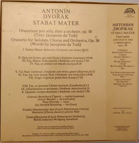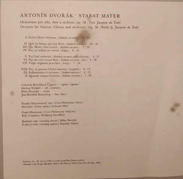| Artist | The Czech Philharmonic Orchestra | Antonín Dvořák | Peter Dvorský | Czech Philharmonic Chorus | Gabriela Beňačková | Ortrun Wenkel | Wolfgang Sawallisch | Jan-Hendrik Rootering |