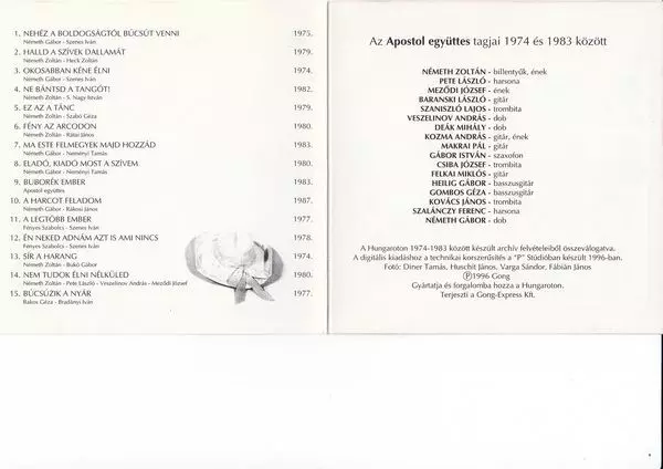 Apostol: Aranyalbum - Nehéz A Boldogságtól Búcsút Venni version on CD in Standard edition. This particular edition was published in Hungary in publishing company Gong on 6. September 1996. Album spans genres Rock, Pop, Schlager and Soft Rock.