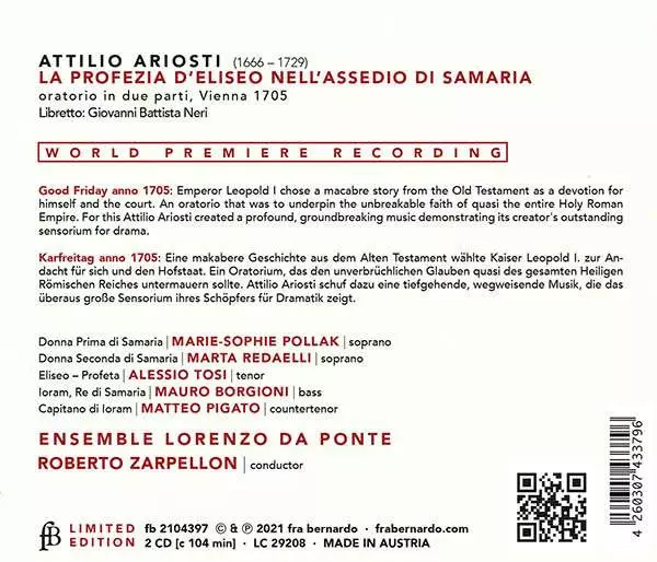 Attilio Ariosti: La Profezia D'Eliseo LTD version on 2CD in limited edition. This particular edition was published in Europe in publishing company Fra Bernardo on 20. August 2021. Album spans genres Classical, Baroque and Oratorio.