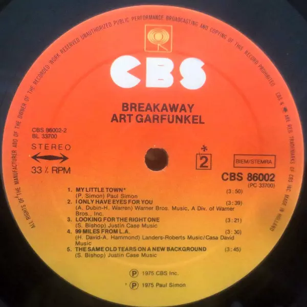 Art Garfunkel: Breakaway version on vinyl LP in Standard edition. This particular edition was published in Europe in publishing company CBS year 1975. Album spans genres Rock, Pop and Soft Rock.