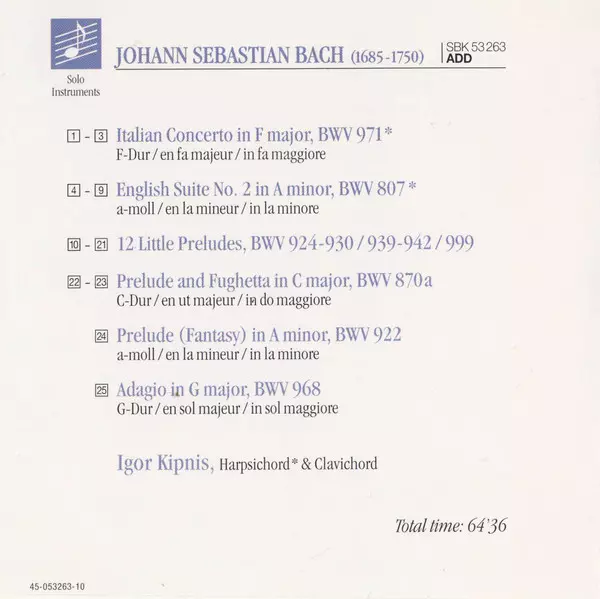| Artist | Johann Sebastian Bach | Igor Kipnis |