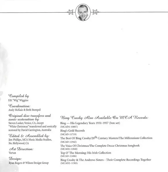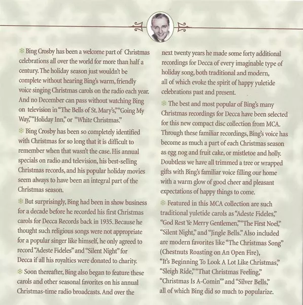 Bing Crosby: The Best Of Bing Crosby version on CD in Remastered edition. This particular edition was published in USA in publishing company MCA Records in cooperation with Chronicles on 7. October 2004. Album spans genres Pop and Holiday.