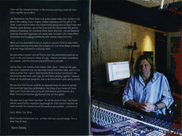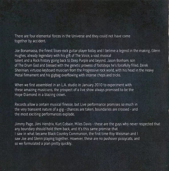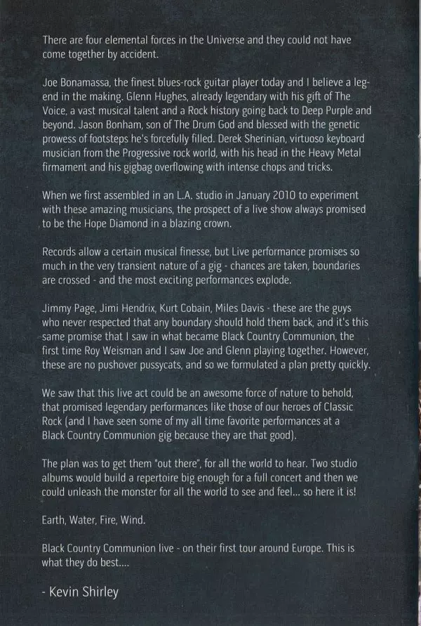 Black Country Communion is a supergroup consisting of Glenn Hughes (vocals, bass), Joe Bonamassa (guitar), Derek Sherinian (keyboards) and Jason Bonham (drums). The band's first album Black Country was released in 2010. The band's second album, 2, was released in 2011. The band's third album, Afterglow, was released in 2013. The band's fourth album, BCCIV, was released in 2017. The band's first live album, Black Country Communion : Live Over Europe, was released in 2012. The album was recorded in November 2011 in Tilburg, the Netherlands. The album was released in the United States on July 17, 2012.