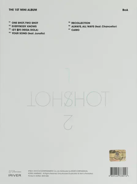 Boa: One Shot, Two Shot version on CD in Standard edition. This particular edition was published in South Korea in publishing company S.M. Entertainment on 9. March 2018. Album spans genres Pop and K-pop.