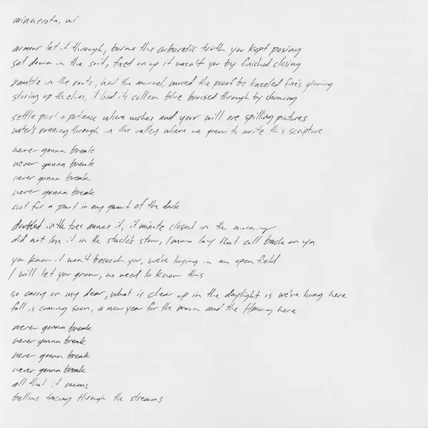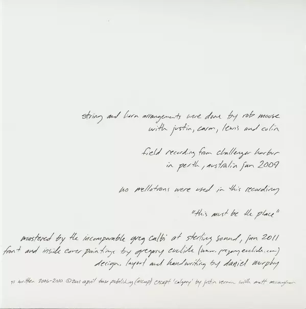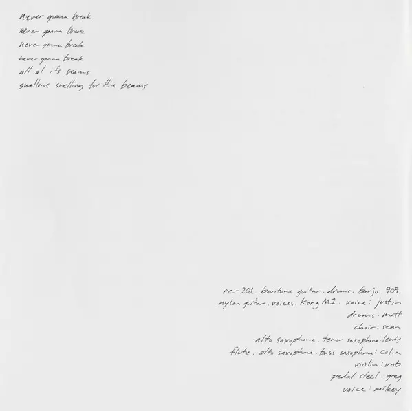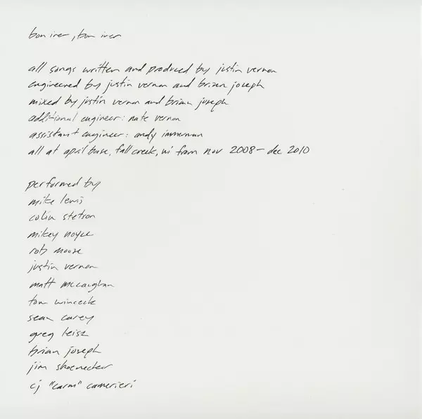 Effects [Re-201], Drums Matt McCaughan | Songwriter [With] Matt McCaughan | Synthesizer [Korg M1], Guitar [Tape Head], Guitar [High Strung], Voice, Bass, Electric Guitar, Baritone Guitar Justin Vernon | Voice [Phone Call] Kyle Frenette