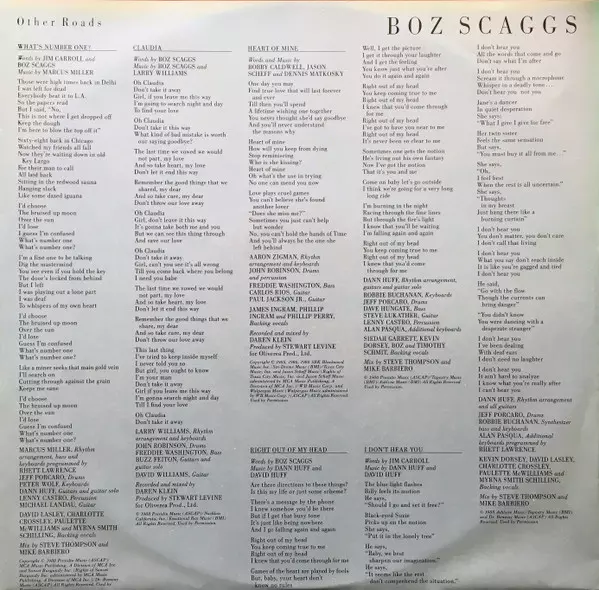 Boz Scaggs: Other Roads version on vinyl LP in Standard edition. This particular edition was published in Europe in publishing company CBS on 30. August 1988. Album spans genres Rock, Pop Rock and Soft Rock.