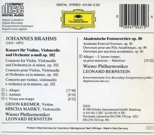 | Artist | Wiener Philharmoniker | Leonard Bernstein | Johannes Brahms | Gidon Kremer | Mischa Maisky |