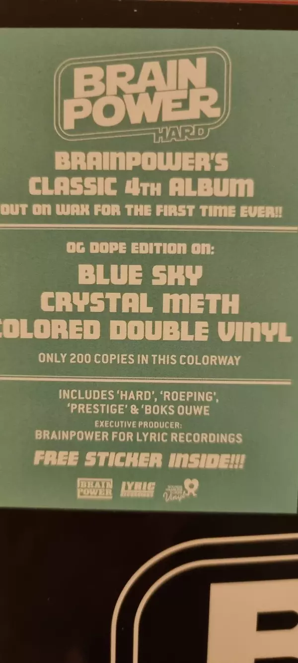 Brainpower: Hard LTD | CLR version on vinyl 2LP in limited colored edition. This particular edition was published in Netherlands in publishing company Lyric Recordings in cooperation with Sounds Haarlem Likes Vinyl on 23. April 2022. Album can be classified in the genre Hip Hop. Blue Sky Crystal Meth Coloured Vinyl Limited Edition.