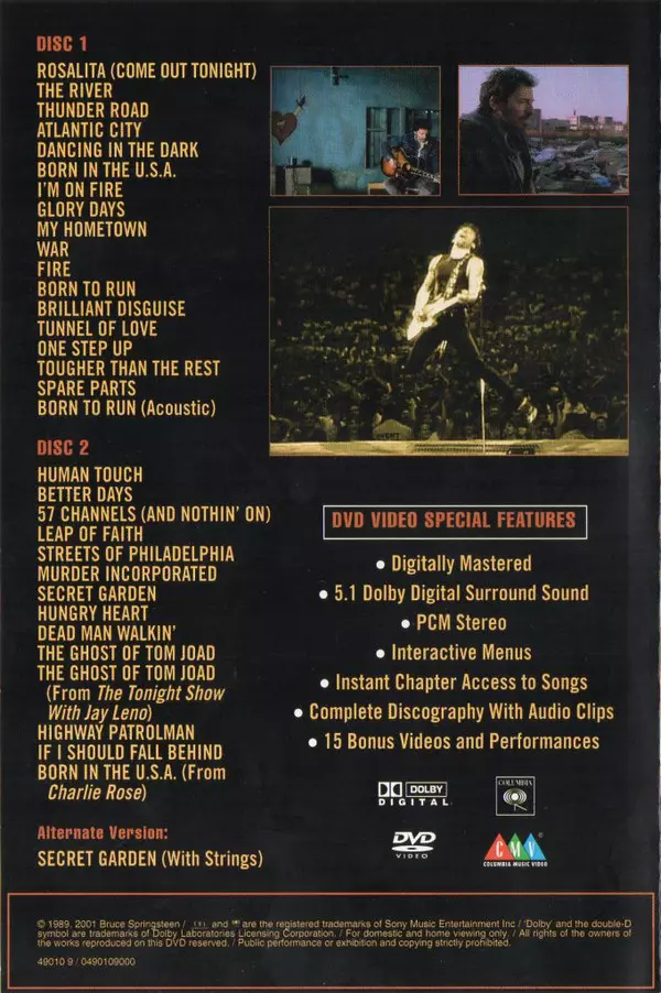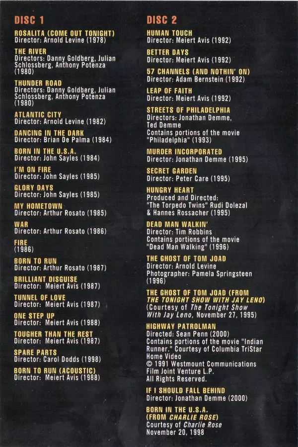 Bruce Springsteen - The Complete Video Anthology / 1978 - 2000 Disc 1: USA: Rosalita (Come Out Tonight) The River Thunder Road Atlantic City Dancing In The Dark Born In The U.S.A. I'm On Fire Glory Days My Hometown War Fire Born To The Run Brilliant Disguise Tunnel Of Love One Step Up Tougher Than The Rest Spare Parts Born To Run (Acoustic) Disk...
