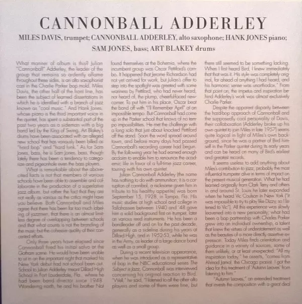 One of the most famous recording dates in modern jazz history, the chemistry between Adderley, Miles Davis, Hank Jones, Sam Jones and Art Blakey is amazing. Their radical reworkings of "Autumn Leaves" and "Love For Sale" are masterpieces. The title track by Miles and "One For Daddy-O" by Nate Adderley are classics. Includes additional photos by ...