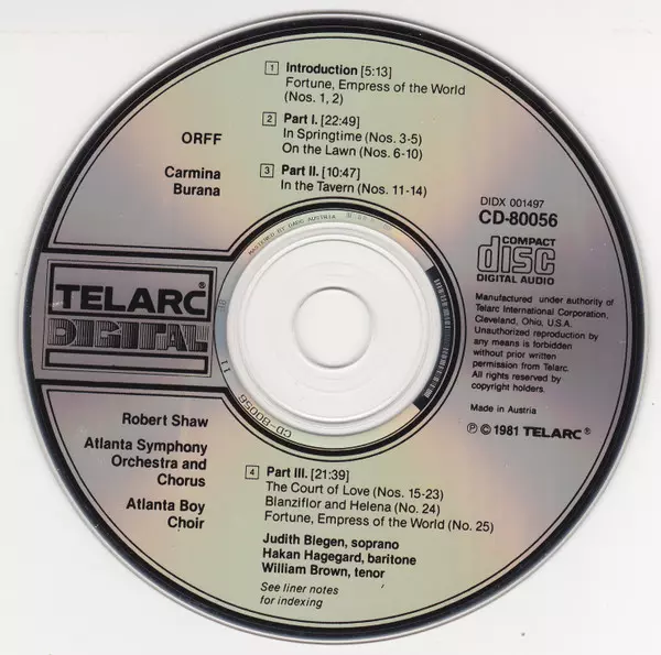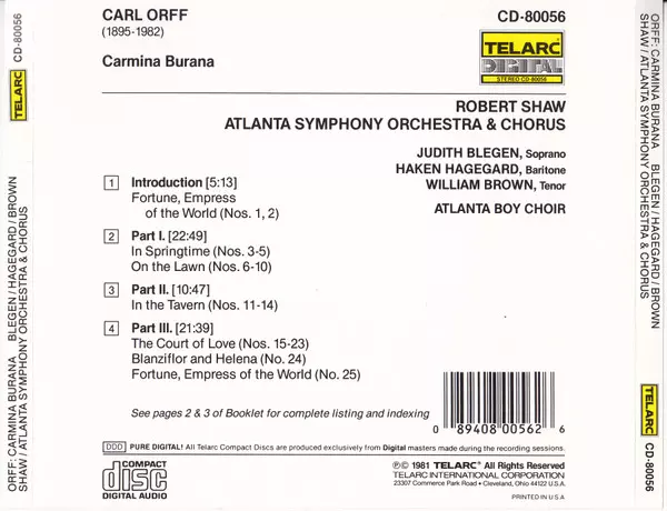 | Artist | Carl Orff | Robert Shaw | Atlanta Symphony Orchestra | Atlanta Symphony Chorus | Håkan Hagegård | Judith Blegen | The Atlanta Boy Choir | William Brown |