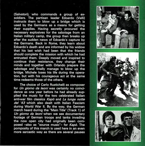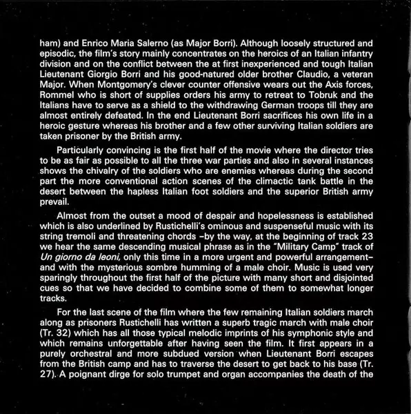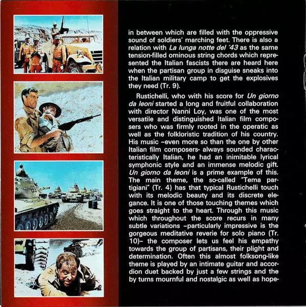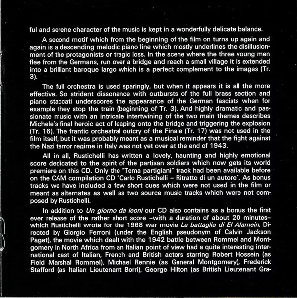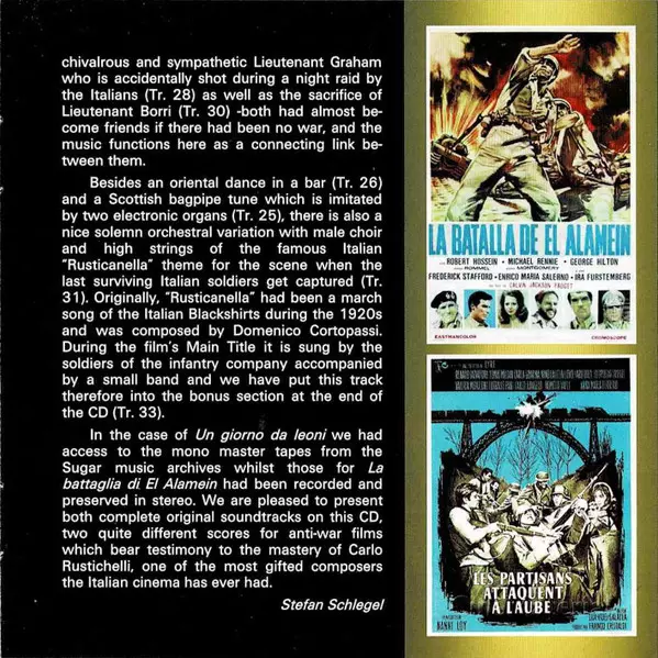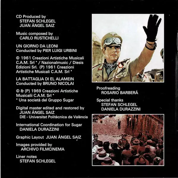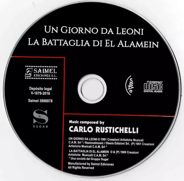 Carlo Rustichelli: Un Giorno Da Leoni / La Battaglia Di El Alamein (Original Motion Picture Soundtracks) version on CD in Standard edition. This particular edition was published in Spain in publishing company Saimel Ediciones, S.L. on 9. September 2016. Album spans genres Stage & Screen, Partiture and Soundtrack.