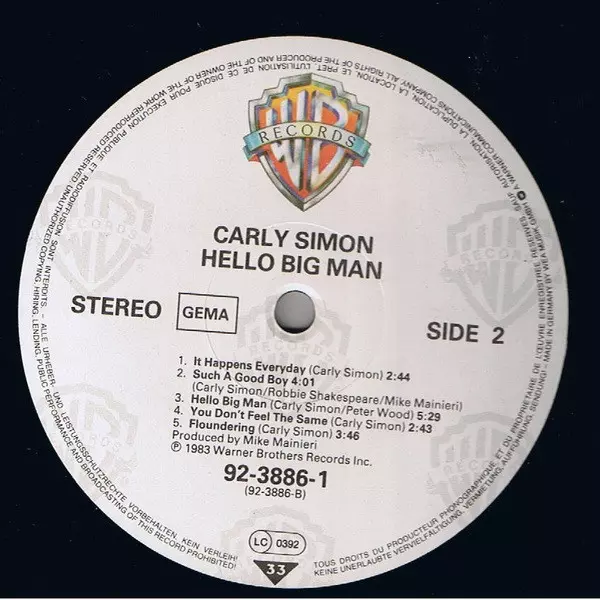 Carly Simon: Hello Big Man version on vinyl LP in Standard edition. This particular edition was published in Germany in publishing company Warner Bros. Records year 1983. Album spans genres Rock, Pop, Vocal and Pop Rock.
