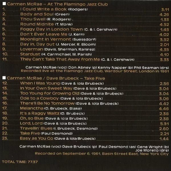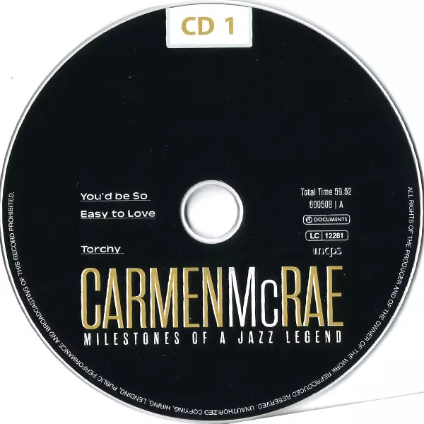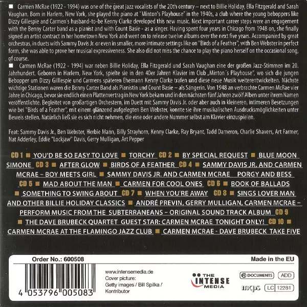 Carmen McRae: Milestones Of A Jazz Legend version on CD/Box Set in Standard edition. This particular edition was published in Europe in publishing company The Intense Media in cooperation with Documents on 24. May 2019. Album can be classified in the genre Jazz.
