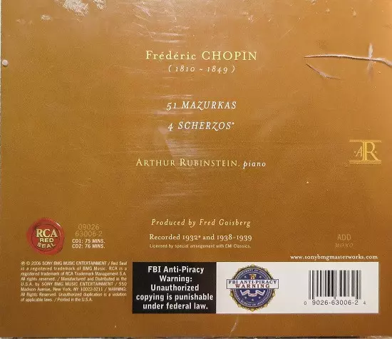 Frédéric Chopin: 51 Mazurkas, Scherzos version on 2CD in Remastered edition. This particular edition was published in USA in publishing company RCA Red Seal on 9. October 2001. Album spans genres Classical and Romantic.