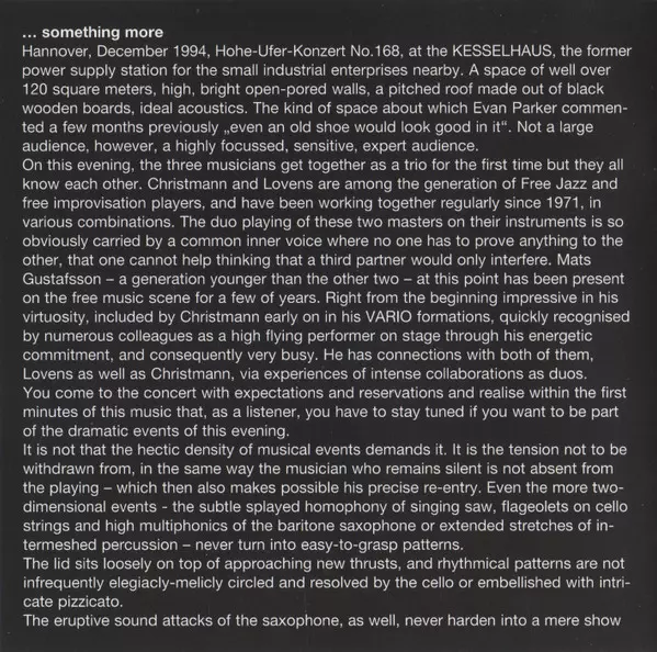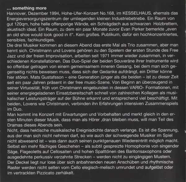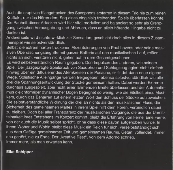 | Artist | Mats Gustafsson | Paul Lovens | Günter Christmann | TR!O |