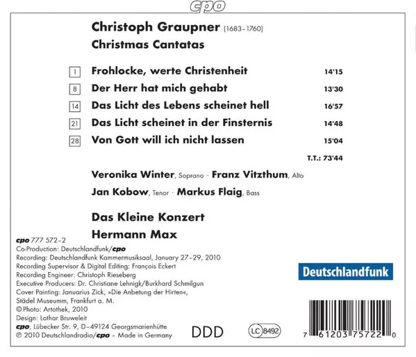 | Artist | Christoph Graupner | Jan Kobow | Das Kleine Konzert | Hermann Max | Veronika Winter | Franz Vitzthum | Markus Flaig |