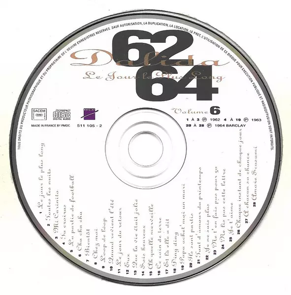 Dalida: Le Jour Le Plus Long - Volume 6 version on CD in Standard edition. This particular edition was published in France in publishing company Barclay on 30. June 1998. Album spans genres Pop, Vocal and Chanson.