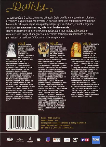 Dalida: Une Vie LTD version on 3DVD in limited edition. This particular edition was published in France in publishing company Universal on 5. October 2009. Album spans genres Pop, Funk / Soul, Balad, Chanson and Disco.
