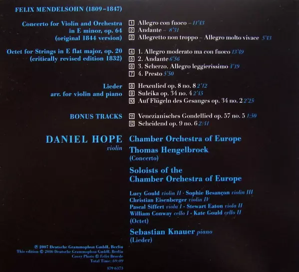 Cello [II] Kate Gould | Cello [I] William Conway | Composed By Felix Mendelssohn-Bartholdy | Ensemble The Chamber Orchestra Of Europe | Viola [II] Stewart Eaton | Viola [I] Pascal Siffert | Violin [III] Sophie Besancon | Violin [II] Lucy Gould | Violin [IV] Christian Eisenberger | Violin [I] Daniel Hope