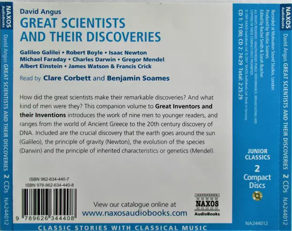 David Angus: Great Scientists And Their Discoveries version on CD in Standard edition. This particular edition was published in United Kingdom in publishing company Naxos Audiobooks on 1. March 2007. Album spans genres Non-Music, Audiobook and Educational.