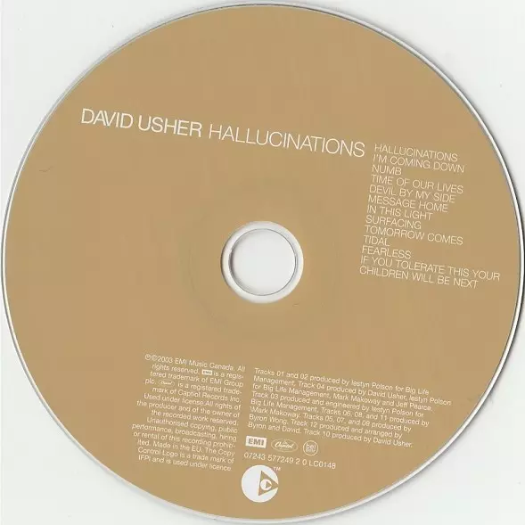 David Usher: Hallucinations version on CD in Standard edition. This particular edition was published in Europe in publishing company EMI Music Canada on 27. October 2017. Album spans genres Rock and Alternative rock.
