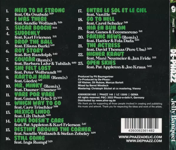 De-Phazz: Jelly Banquet version on CD in Standard edition. This particular edition was published in Germany in publishing company Phazz-a-delic on 30. September 2022. Album spans genres Pop, Electronic, Jazz, Funk / Soul, Downtempo and Jazzdance.