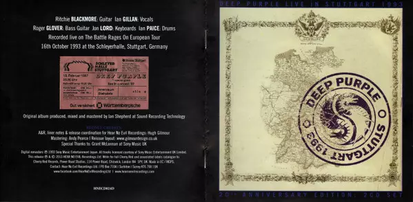 In 1993, Deep Purple's live album "Live In Stuttgart 1993" was released. It is a live recording of a concert in Stuttgart's Schleyerhalle on October 16, 1993, which the band played with the classic Mk2 line-up. They included Ritchie Blackmore, Ian Gillan, Roger Glover, Jon Lord and Ian Paice. The programme includes classics such as "Highway Star...