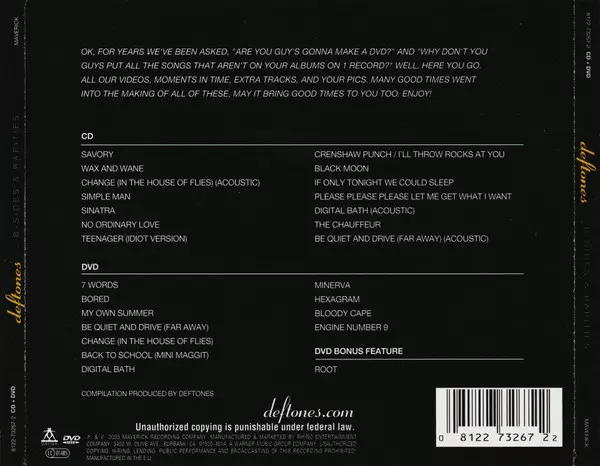 Deftones: B-Sides & Rarities version on CD/DVD in Remastered edition. This particular edition was published in Europe in publishing company Maverick on 13. January 2008. Album spans genres Rock, Heavy Metal and Nu Metal.
