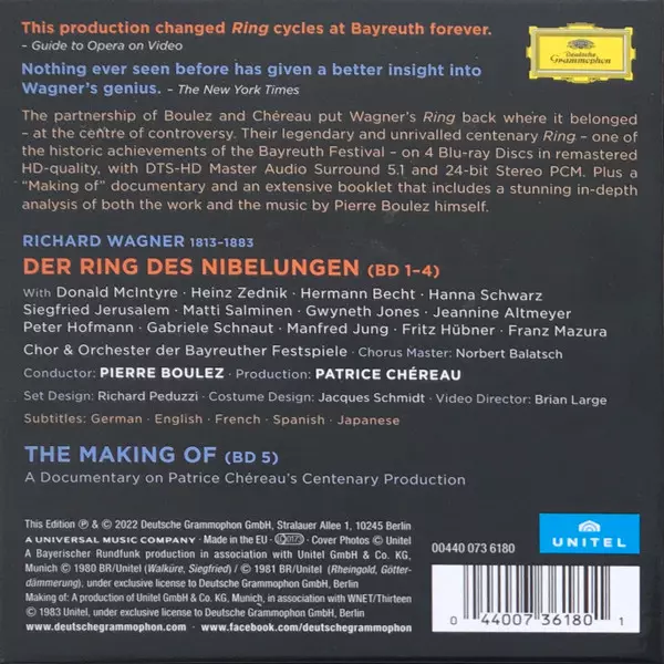 Richard Wagner: Der Ring Des Nibelungen version on Box Set/5Blu-ray in Remastered edition. This particular edition was published in Europe in publishing company Deutsche Grammophon on 22. July 2022. Album spans genres Classical, Romantic and Opera.