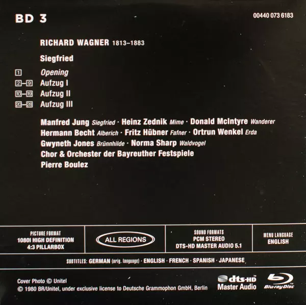 Camera Operator Franz Knoll (2), Fritz Beckhoff | Executive-Producer Philippe Deriaz | Featuring Brian Large, Donald McIntyre, Friedelind Wagner, Gwyneth Jones, Jeannine Altmeyer, Jeffrey Tate, Patrice Chéreau, Pierre Boulez, William Mann, Wolfgang Wagner (6) | Film Producer, Film Director Peter Weinberg | Narrator George Grizzard | Technician [Sound] Leonardo Ruschin, Peter Kellerhals, Rolf Peter Schröder | Written-By John Ardoin