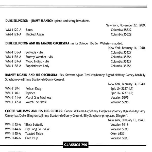 | Arranged By, Piano Billy Strayhorn | Baritone Saxophone Harry Carney | Bass [String Bass] Jimmy Blanton | Clarinet Barney Bigard | Cornet Rex Stewart | Drums Sonny Greer | Valve Trombone Juan Tizol | Written-By Billy Strayhorn | |||