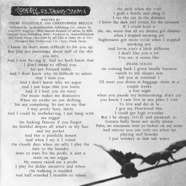 Featuring Frank Ocean | Keyboards Frank Ocean | Producer Frank Ocean, randomblackdude | Recorded By James Ho, Jeff Ellis | Written-By Christopher Breaux, Thebe Kgositsile