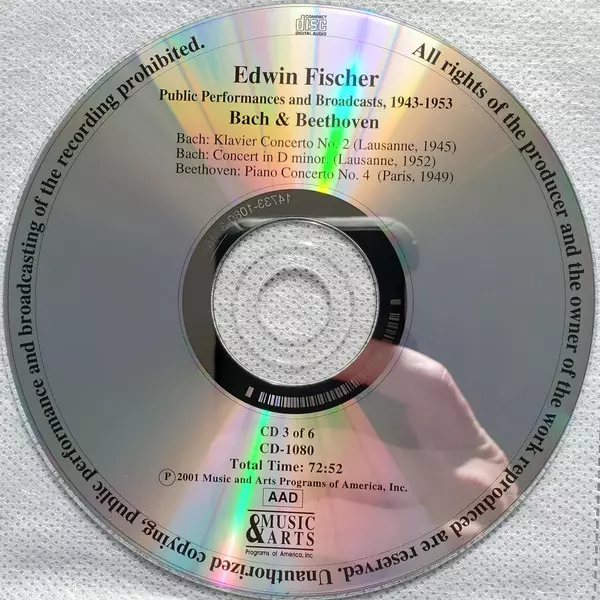 Edwin Fischer: The Legacy Of A Great Pianist (Concert Performances And Broadcasts 1943-1953) version on 6CD/Box Set in Standard edition. This particular edition was published in USA in publishing company Music & Arts on 23. October 2001. Album spans genres Classical, Baroque and Romantic.