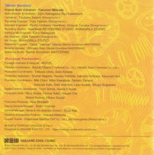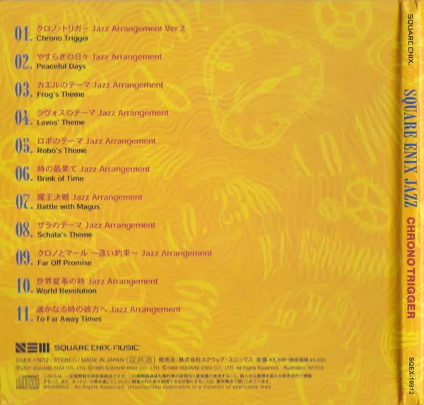 Ryu Kawamura: Square Enix Jazz -Chrono Trigger- = スクウェア・エニックス ジャズ -クロノ・トリガー- version on CD in Standard edition. This particular edition was published in Japan in publishing company Square Enix Music on 26. January 2022. Album spans genres Stage & Screen, Jazz, Soundtrack and Video Game Music.