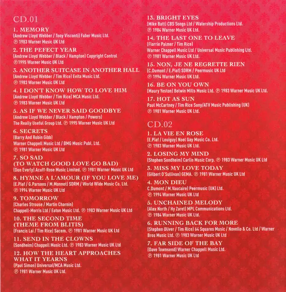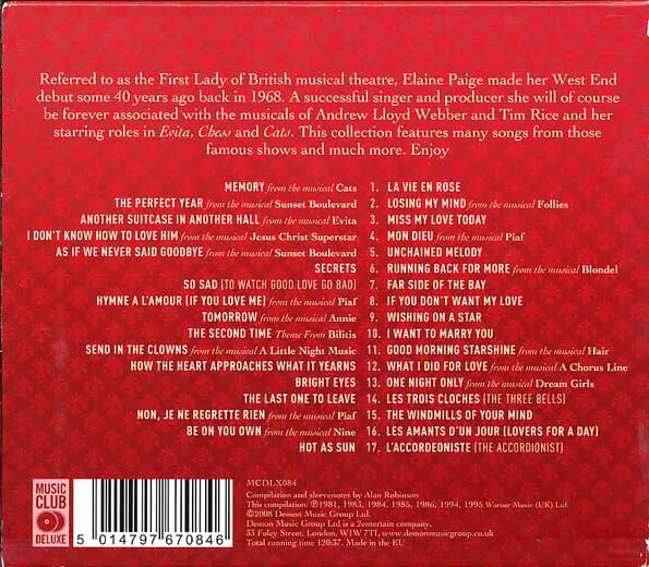 Elaine Paige: Sweet Memories (The Essential Elaine Paige) version on 2CD in Standard edition. This particular edition was published in United Kingdom in publishing company Music Club Deluxe on 29. June 2006. Album spans genres Stage & Screen and Musical.