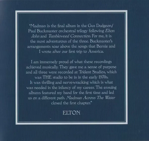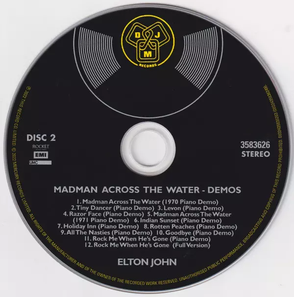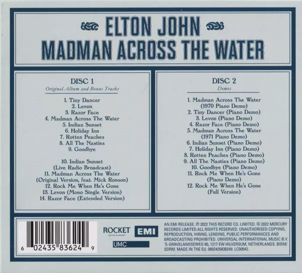 Elton John: Madman Across The Water LTD version on 2CD in Remastered limited edition. This particular edition was published in Worldwide in publishing company Rocket Entertainment in cooperation with EMI, UMC and DJM Records (2) on 10. June 2022.