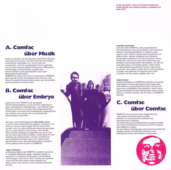 Embryo is a German progressive rock and jazz fusion band that was founded in Munich in 1969 by Christian Burchard. The group is known for its unique blend of jazz, rock, and ethnic music, often incorporating elements from African, Middle Eastern, and Indian musical traditions. Thro...
