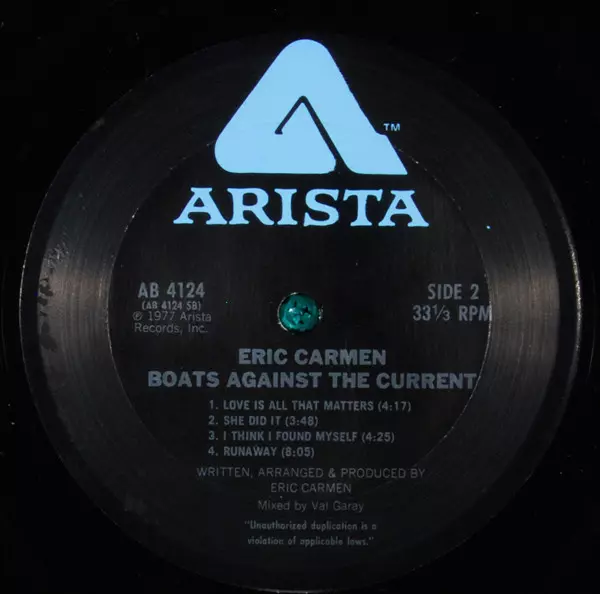 Eric Carmen: Boats Against The Current version on vinyl LP in Standard edition. This particular edition was published in USA in publishing company Arista year 1977. Album spans genres Rock, Pop Rock and Soft Rock. Terre Haute Pressing Gatefold Vinyl.