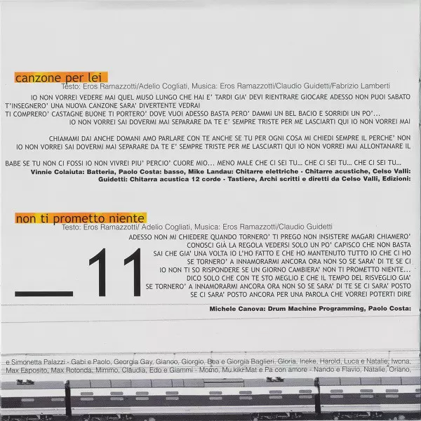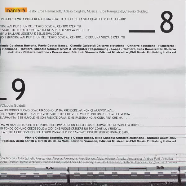 Arranged By [Strings], Conductor Celso Valli | Bass Paolo Costa | Drums, Percussion Vinnie Colaiuta | Electric Guitar Michael Landau | Keyboards Celso Valli | Lyrics By Adelio Cogliati, Eros Ramazzotti | Music By Claudio Guidetti, Eros Ramazzotti | Piano, Acoustic Guitar Claudio Guidetti