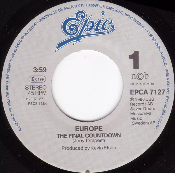Europe: The Final Countdown version on vinyl SP in 45 RPM edition. This particular edition was published in Europe in publishing company Epic year 1986. Album spans genres Rock, Pop Rock and Hard Rock.