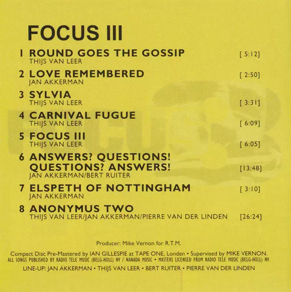 Focus 3 is an album by the Dutch rock band Focus. It is the band's third studio album and contains the hit single "Hocus Pocus". The album has been praised by critics for its eclectic mix of rock, jazz and classical music.