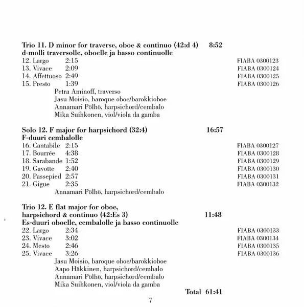 | Trio 12. E Flat Major For Oboe, Harpsichord & Continuo (42:Es 3) | 11:48 min | |
