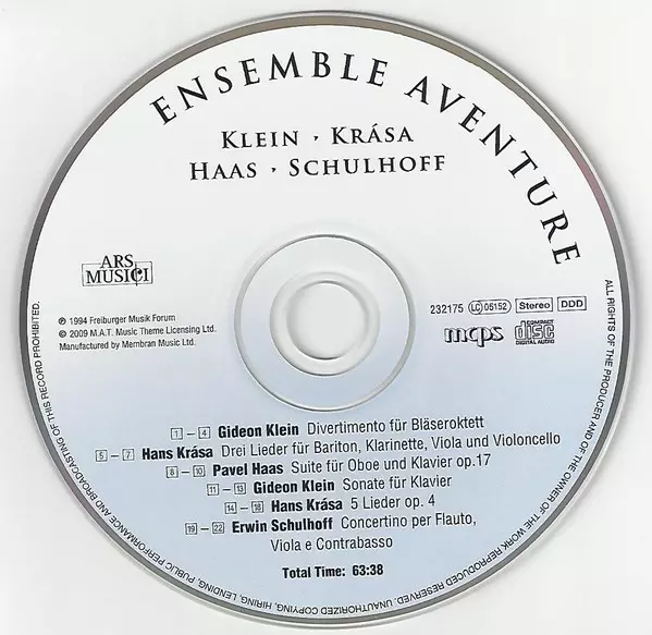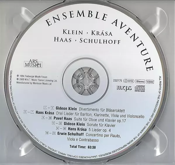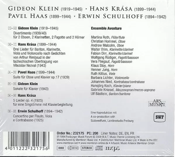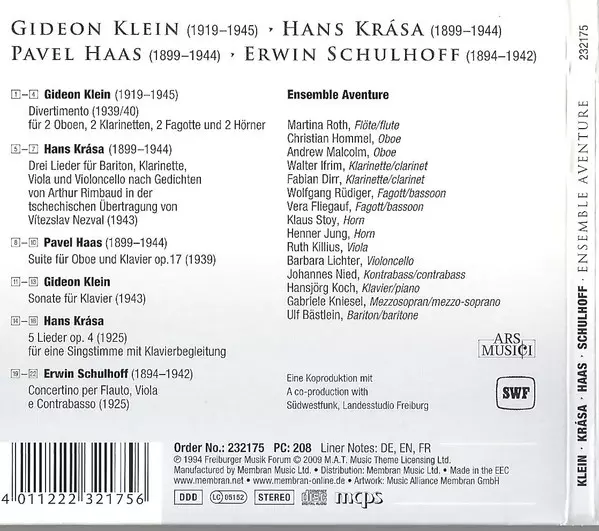 | Artist | Erwin Schulhoff | Pavel Haas | Hans Krása | Gideon Klein | Ensemble Aventure |